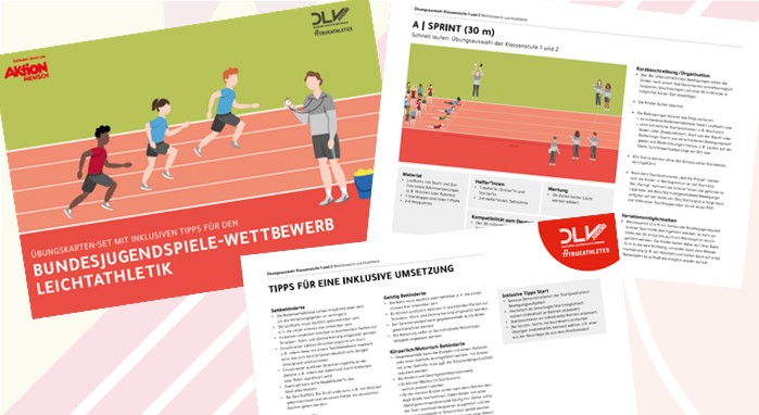 Über die Förderung der „Aktion Mensch“ konnten wir ein Übungskarten-Set mit einer Auflage von 5.000 Stück drucken lassen. Das Set beinhaltet insgesamt 28 verschiedene Karten. Auf der ersten Karte finden sich übergreifende Hinweise, wie behinderte Kinder in der Leichtathletik teilhaben können. Auf den übrigen 27 Karten sind die Übungskarten aus dem offiziellen Handbuch Bundesjugendspiele für die Klassen 1 bis 4 abgebildet. Jeweils auf der Rückseite sind Ideen für die inklusive Umsetzung der jeweiligen Übung zu finden. Die Karten sind sowohl für den Einsatz im Sportunterricht als auch bei der Durchführung der Bundesjugendspiele (als Stationskarten) vorgesehen.