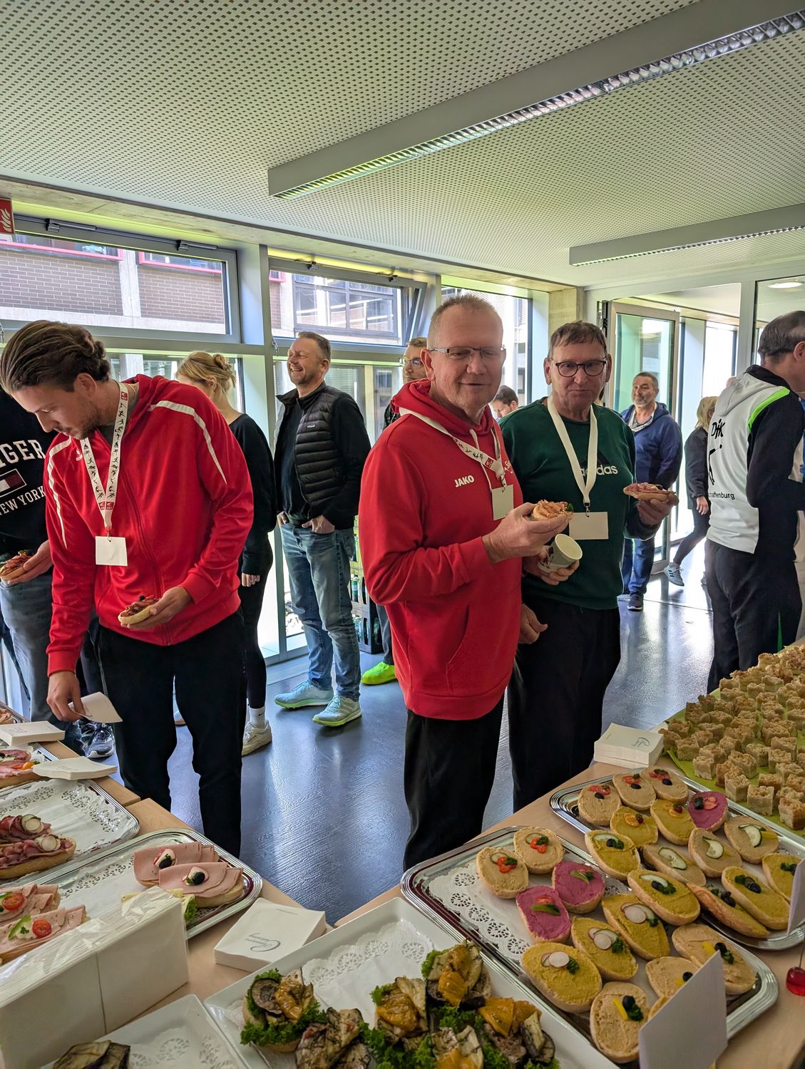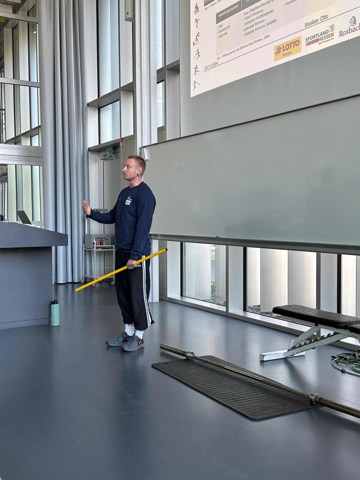 Im Anschluss begann die erste von zwei Workshopphasen. Dort wurden die Teilnehmenden in vier Workshops aufgeteilt. Der Trainingswissenschaftler vom OSP Hessen, Stefan Erlewein, thematisierte in seinem Workshop die Speerwurftechnik. Bei der ehemaligen, sehr erfolgreichen Hammerwerferin Kathrin Klaas, stand die Hammerwurftechnik im Fokus. Dabei konnten die Teilnehmenden die Technik in Teilschritten ausprobieren und am Ende mit einem Übungs-Wurfhammer einen Wurf  selbst durchführen. Martin Rumpf erläuterte im dritten Workshop die Grundlagen der Drehstoßtechnik. Der vierte Workshop wurde von Heilpraktiker und Osteopath Peter Ringeisen mit dem Schwerpunkt "Verletzungsprophylaxe für Werfer:innen" gehalten. Im Fokus standen Übungen mit verschiedenen Trainingsmitteln zur Prävention von Verletzungen. Außerdem wurden viele Fallbeispiele von den anwesenden Teilnehmenden diskutiert und gemeinsam nach Lösungsansätzen gesucht.